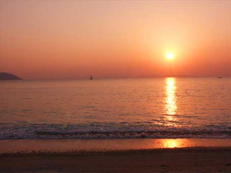 暑〜くて、長〜い一日が終わろうとしている。オクマに着いたのが午後5時を少し回った頃。海に沈む夕日を眺めたくて、少し早めに戻ってきたのだ。短パンにはき替え、少し海でシャバシャバしてから、自販で買ったオリオンビールを片手に、ボーっとした時を過ごした。遠くでクルージングしているヨットが見えた。本当に暑くて、長くて、充実した一日だった。 |