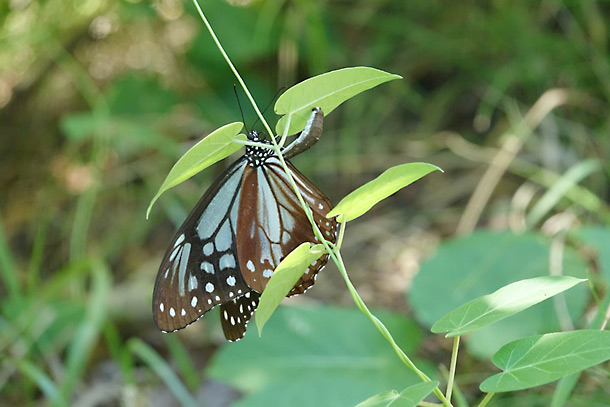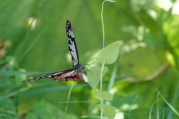 この時期に気になるチョウはアサギマダラですね。例年6月に本州から渡って来て産卵をしてくれて、北海道産の子孫が育ち、9月に成虫になって本州に戻るというパターンですね。初めてアサギマダラを見つけた場所が中札内なので、今年も探しに行きました。 |