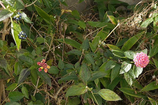 真が撮れましたが、もう既に翅はボロボロでした。しかし、もしかして2025年最後の蝶撮になったのかも知れません。 ついでながら自宅裏のランタナの状態です。花は満開だったり咲きかけだったりしています。実も付いた枝もあります。このランタナ、西暦2000年から4半世紀育ててきました。毎年霜の降る前に植木鉢に移し、自宅内で越冬させ、翌年のG.W.に裏庭に移植するという事を繰り返していましたが、今年は霜が降ってもこのまま手を付けずに居る予定です。 |
